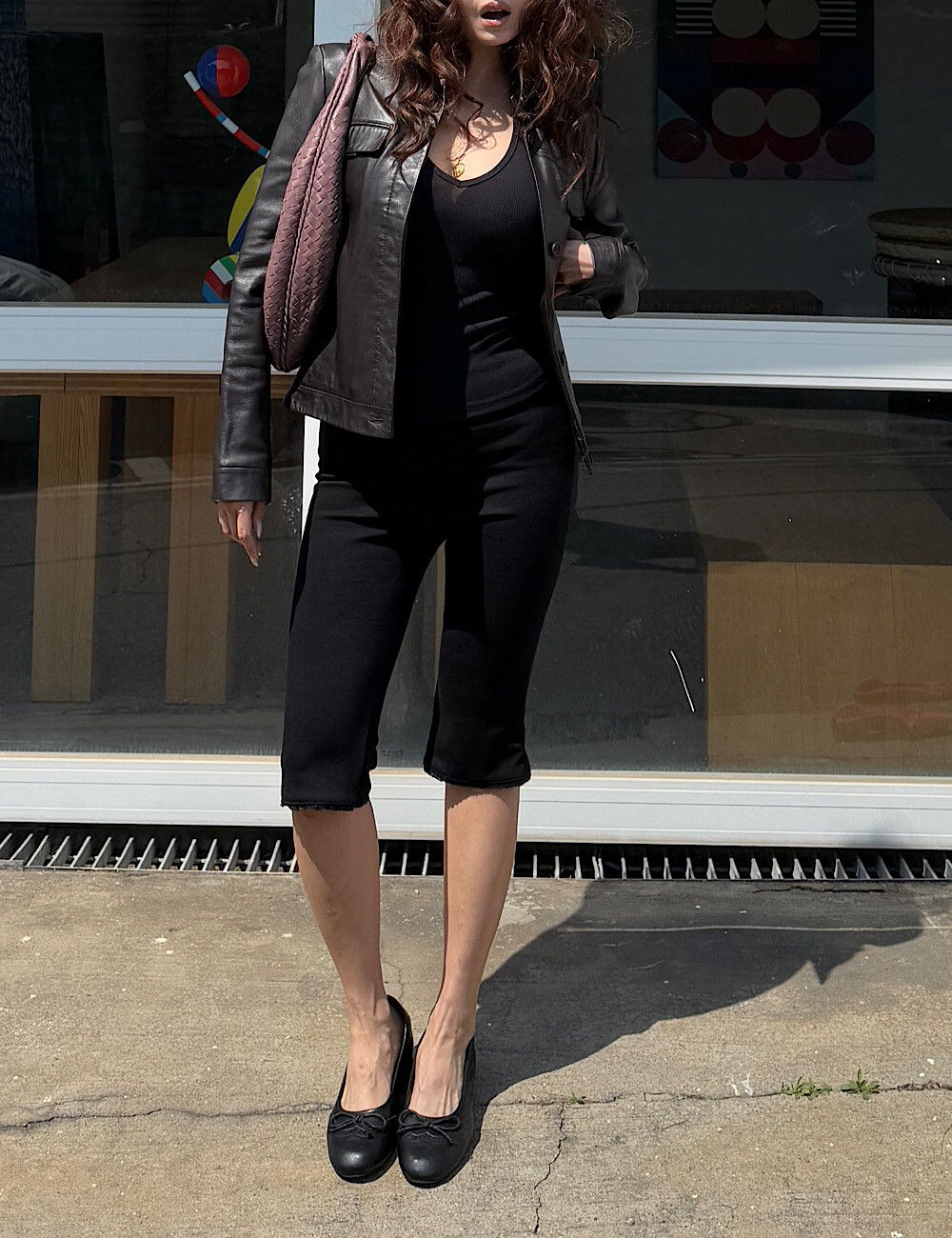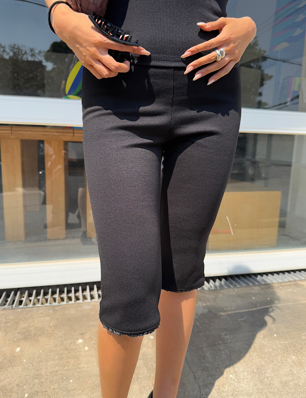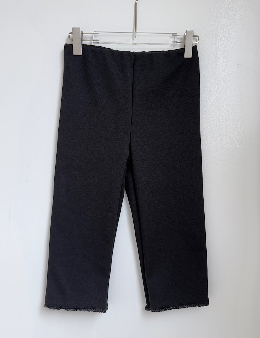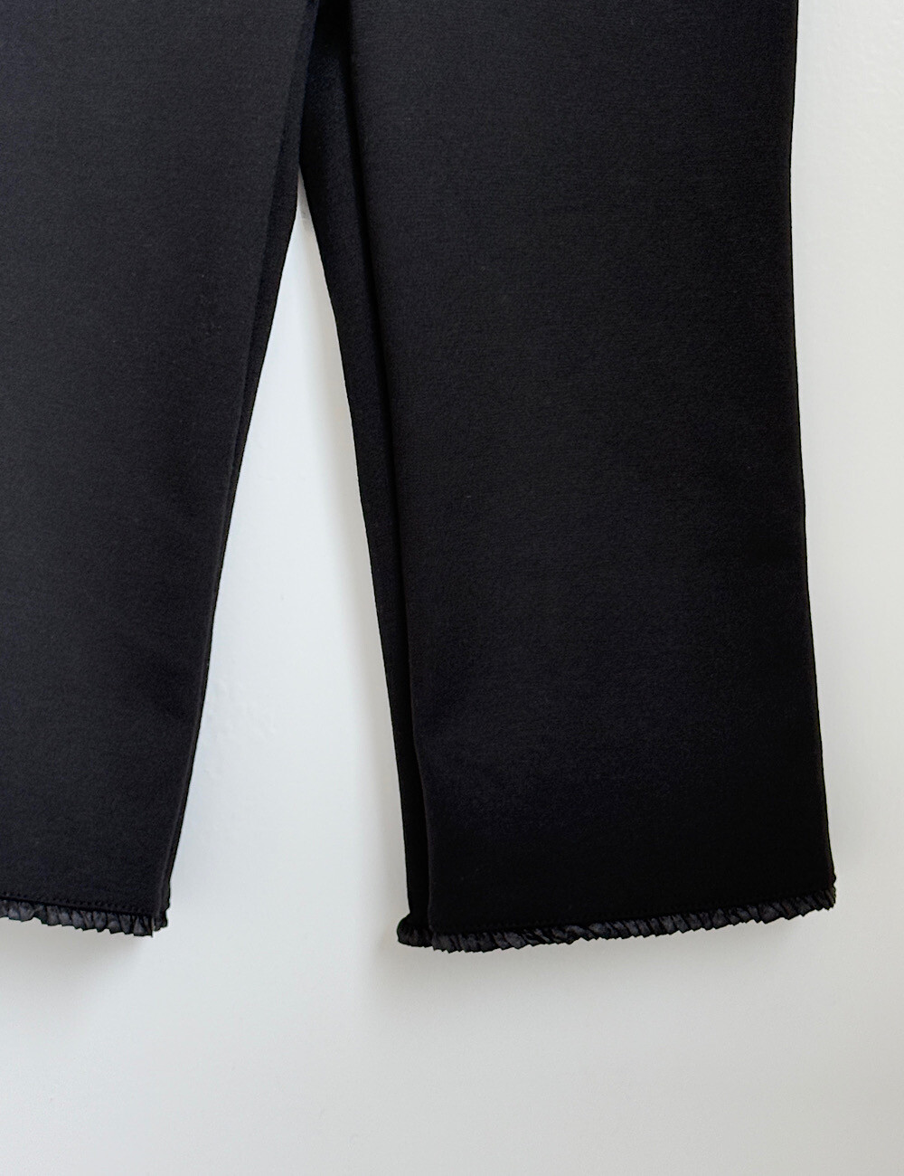 카프리 팬츠는 배 라인을 싹 잡아주는 매직 핏이에요. 허리부터 힙까지 탄탄하게 눌러주니까 실루엣이 정말 매끈해집니다. 특히 밑단의 섬세한 레이스 트리밍은 제가 가장 공들인 포인트!