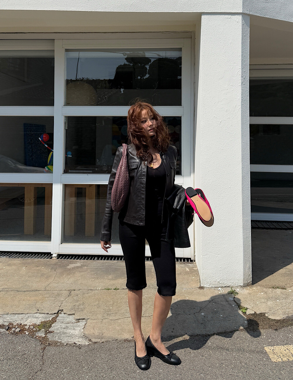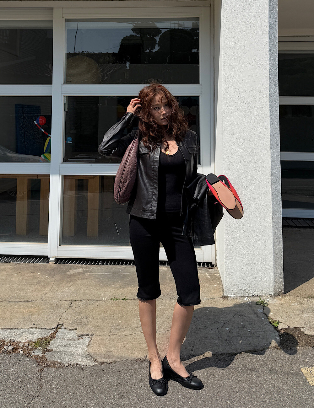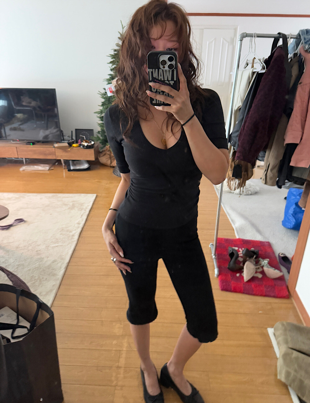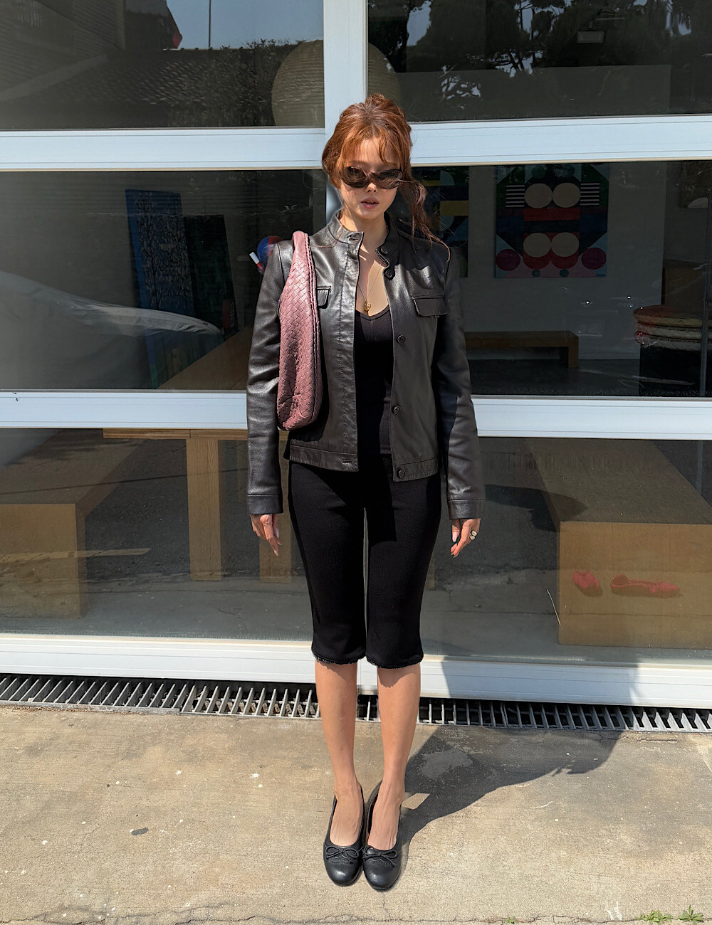 카프리 팬츠는 배 라인을 싹 잡아주는 매직 핏이에요. 허리부터 힙까지 탄탄하게 눌러주니까 실루엣이 정말 매끈해집니다. 특히 밑단의 섬세한 레이스 트리밍은 제가 가장 공들인 포인트!