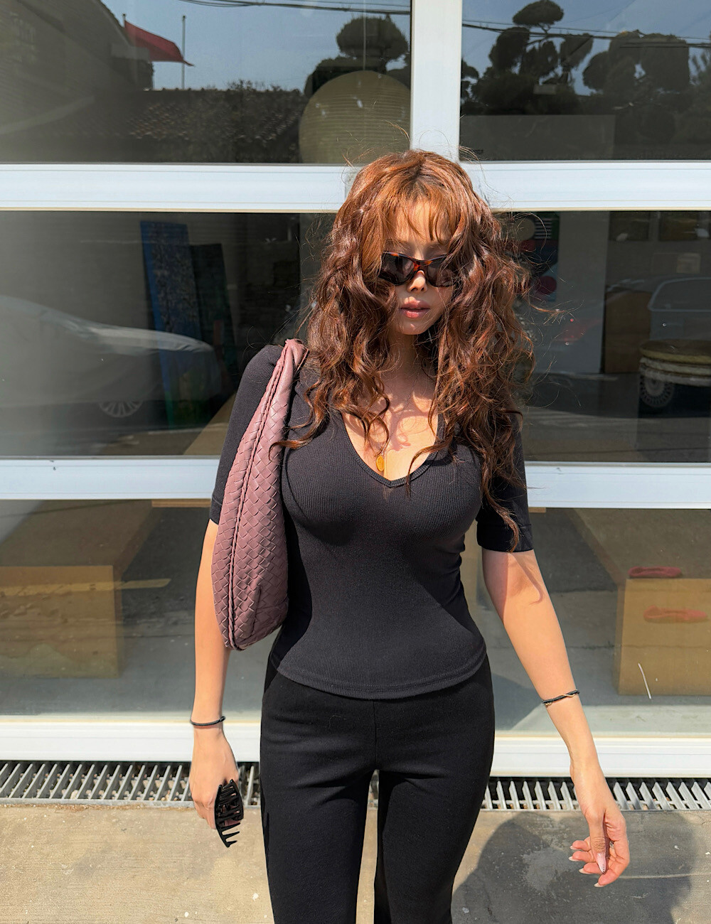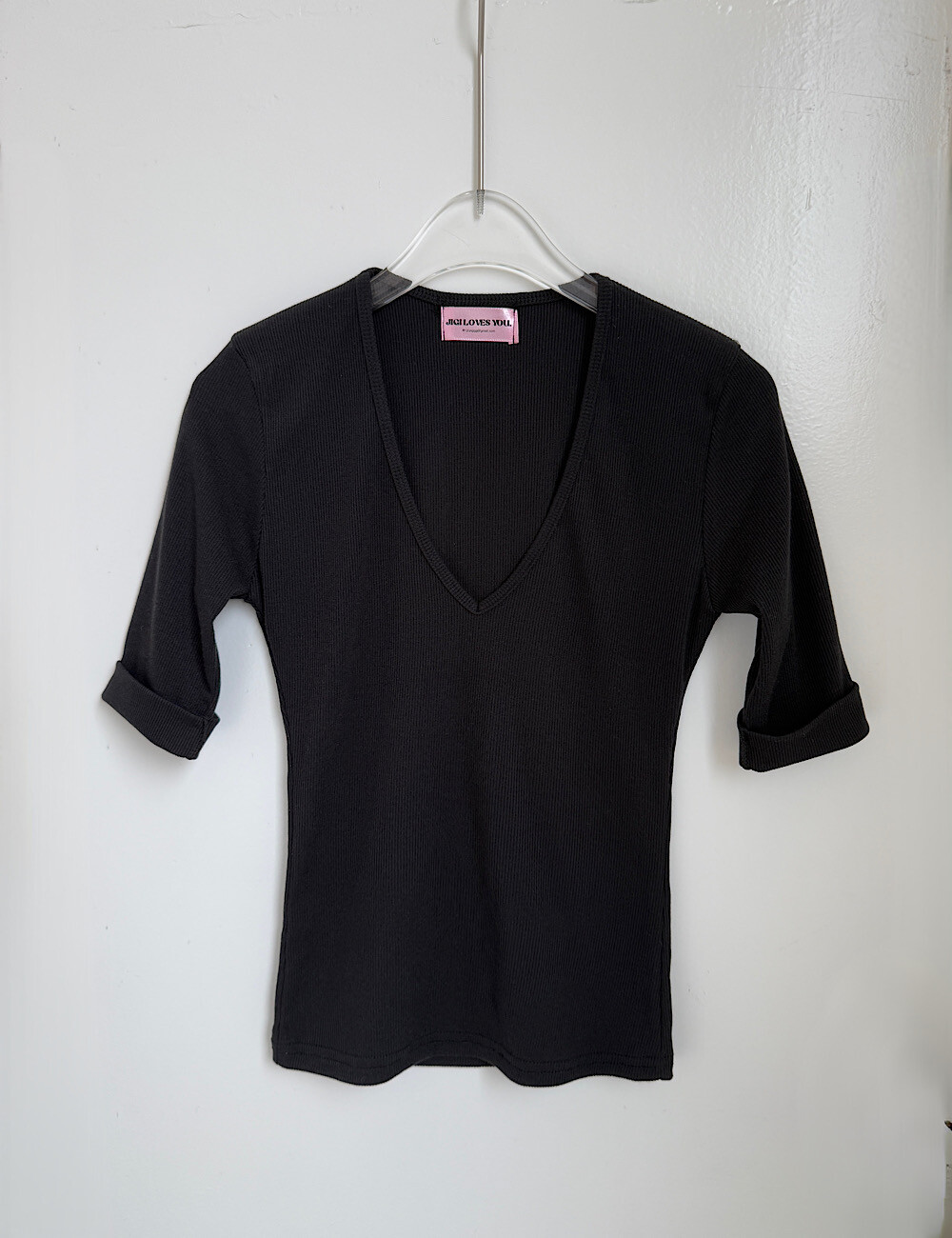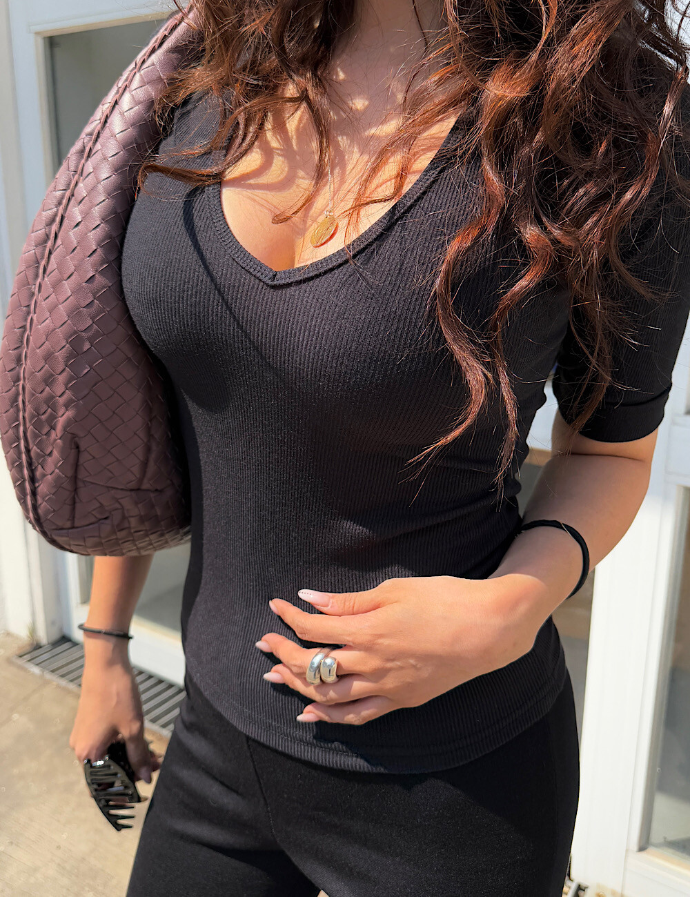 (탄탄한 슬림핏) 흐물거림 없이 탄탄한 소재가 몸매를 딱 잡아줘서 입었을 때 정말 날씬해 보여요. 깊은 V넥으로 얼굴형은 갸름하게, 목선은 길어 보이게 신경 썼습니다. (많이 타이트한 제품이에요!)